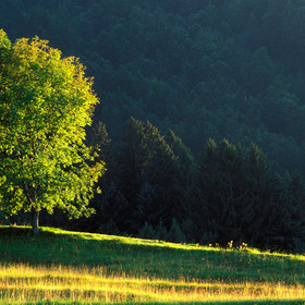 licht, wiese, wald, … baum auf wiese … um auf wiese im streiflicht.